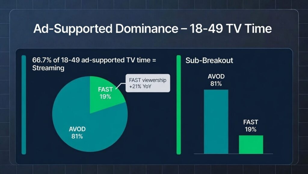 - Ad-Supported Dominance: Streaming now 66.7% of ad-supported TV time for 18-49s; FAST viewership +21% YoY in Q4 2025; >70% of key-market TV time ad-supported.